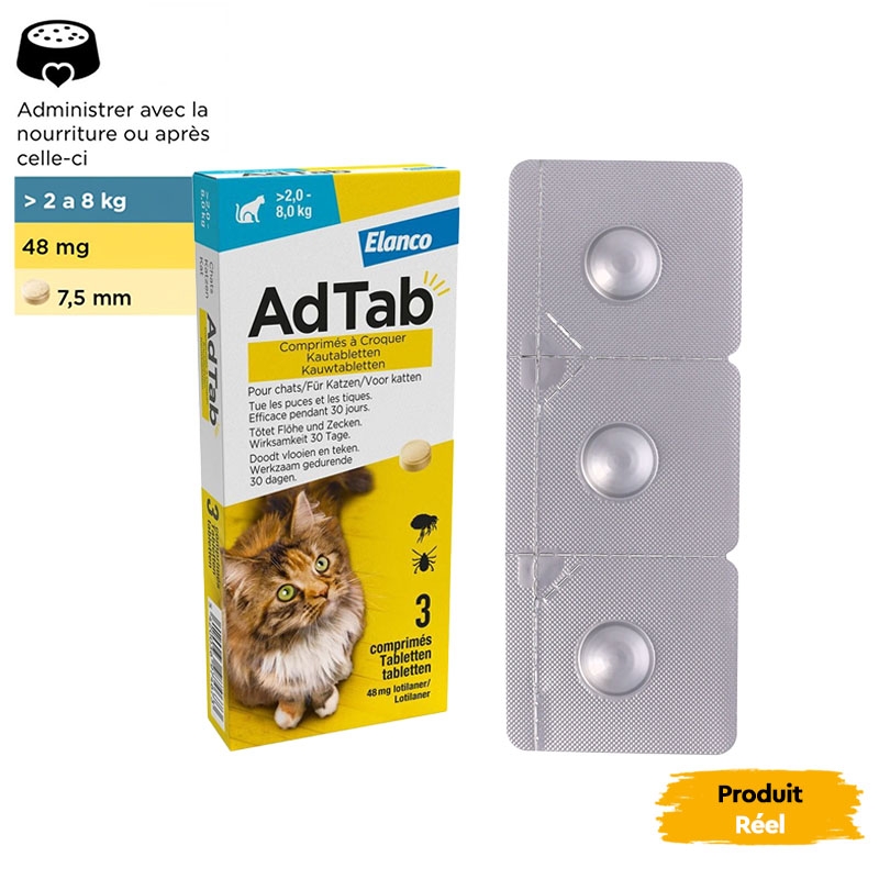 Les avantages d'une seule prise d'Adtab persistent jusqu'à 30 jours, offrant un mois complet de tranquillité pour votre ami poilu. De plus, l'administration est facile et agréable, car ces comprimés ont un irrésistible arôme de vanille et une texture que votre chat appréciera en mâchant.