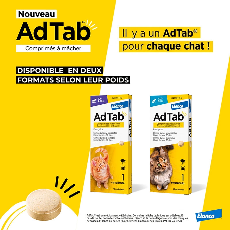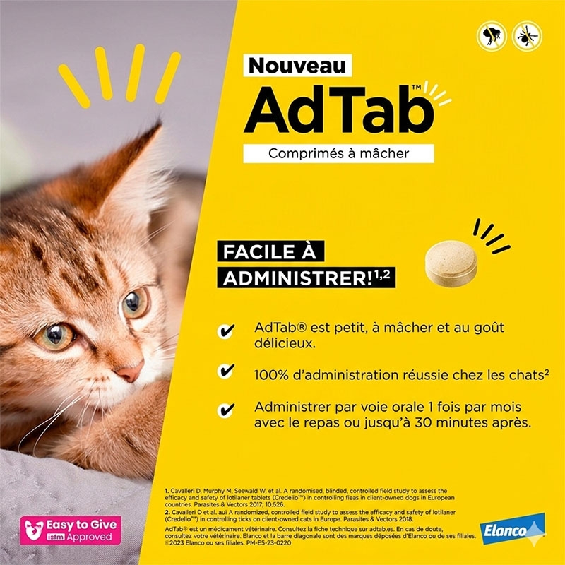 Découvrez Adtab, la solution parfaite pour maintenir votre chat exempt de puces et de tiques de manière facile et confortable ! Ces comprimés masticables antiparasitaires sont conçus pour les chats de toutes races, offrant non seulement une protection efficace, mais aussi une expérience délicieuse pour votre félin.