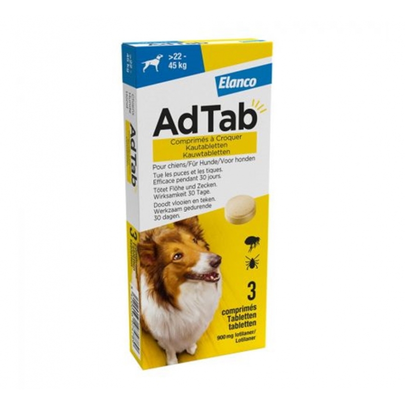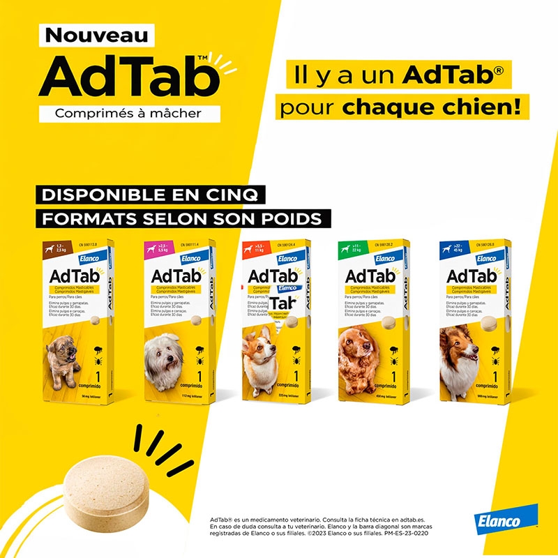 Élaboré par Elanco, AdTab est facile à administrer, car il est mâchable et peut être mélangé à la nourriture ou administré après le repas. Avec un agréable arôme de viande, votre chien acceptera ce comprimé sans problème, assurant des soins efficaces et agréables.
