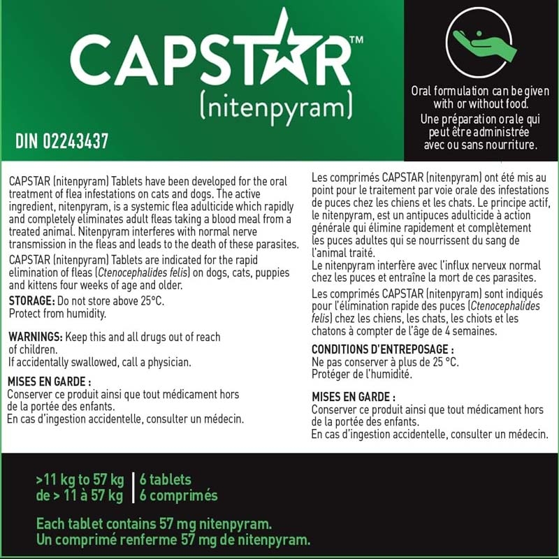 Administrez un comprimé de CAPSTAR 57 mg COMPRIMÉS POUR GRANDS CHIENS à des chiens pesant entre 11,1 kg et 57,0 kg et deux comprimés pour les chiens pesant plus de 57 kg lorsqu'une infestation de puces est détectée.