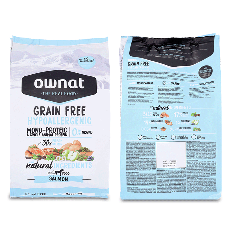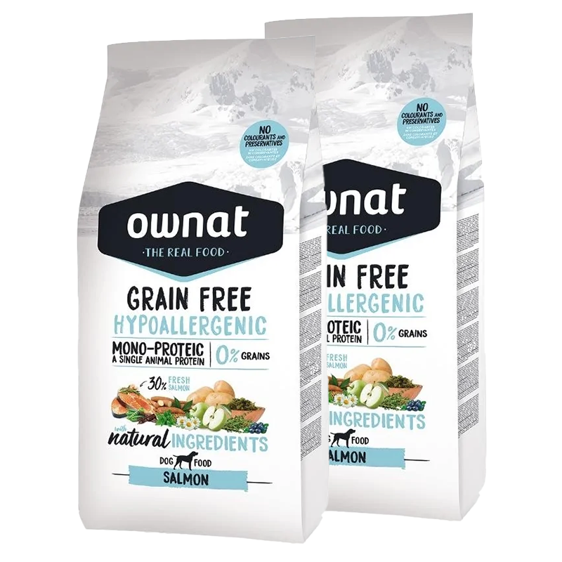 Ownat Grain Free Hypoallergenic est une nourriture haut de gamme pour les chiens qui se caractérise par l'utilisation exclusive du saumon comme unique source de protéines animales. Cette particularité, associée à l'absence de céréales et à l'utilisation d'ingrédients de première qualité, contribue à réduire les risques d'intolérance ou d'allergie alimentaire, tout en facilitant la digestion. De plus, le saumon est une excellente source d'acides gras essentiels oméga-3 et oméga-6, essentiels pour maintenir une peau saine et un pelage brillant.
