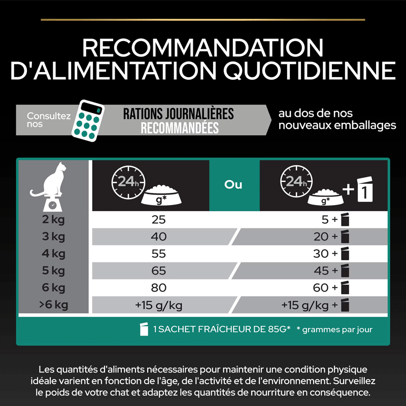 | Poids du chat | Ration quotidienne de croquettes | Croquettes + nourriture humide (85g) |