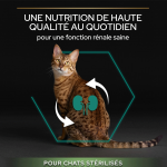 Santé rénale : La formulation est spécifiquement conçue pour stimuler une fonction rénale saine chez les chats qui ont été stérilisés ou castrés. Les nutriments soigneusement sélectionnés contribuent à maintenir les reins de votre animal en excellent état, ce qui est essentiel pour son bien-être général.