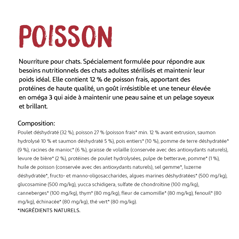 Poisson 37 % (poisson frais* min 20 % avant extrusion, saumon hydrolysé 10 %, poisson déshydraté 7 %), pois entiers* (13 %), poulet déshydraté (11 %), racines de manioc* (10 %), porc déshydraté (9 %), graisse aviaire (conservée avec des antioxydants naturels), pomme de terre déshydratée* (5 %), levure de bière* (3 %), protéine hydrolysée de poulet, pulpe de betterave, pomme* (1 %), huile de poisson (conservée avec des antioxydants naturels), sel gemme*, luzerne déshydratée*, fructo-oligosaccharides et mannan-oligosaccharides, algues marines déshydratées* (500 mg/kg), glucosamine (500 mg/kg), yucca schidigera, sulfate de chondroïtine (100 mg/kg), myrtilles* (100 mg/kg), thym* (80 mg/kg), camomille* (80 mg/kg), fenouil* (80 mg/kg), échinacée* (80 mg/kg), thé vert* (80 mg/kg).