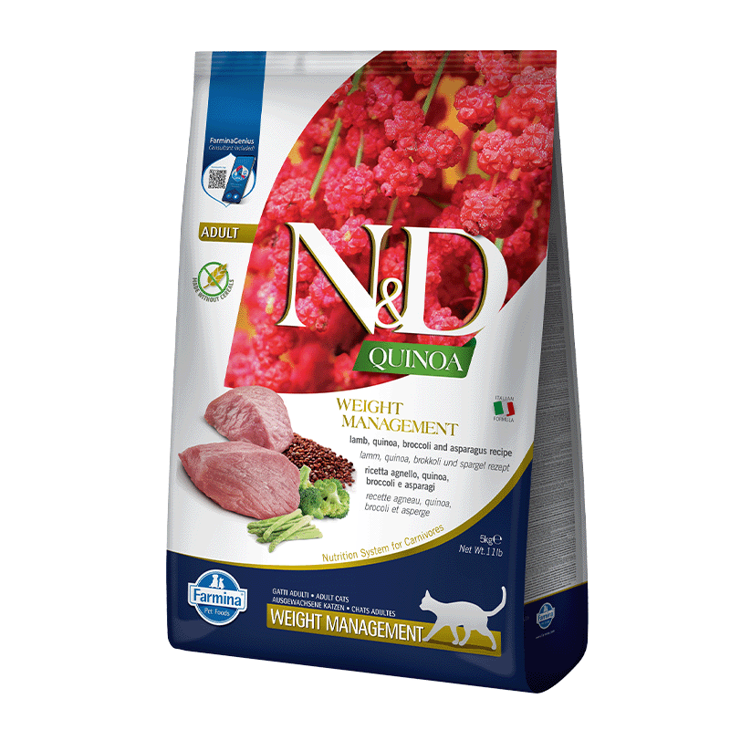 L'alimentation de qualité, faible en calories, de Farmina N&D Quinoa Feline Weight Management Cordero pour chats adultes est faible en gras et en protéines.