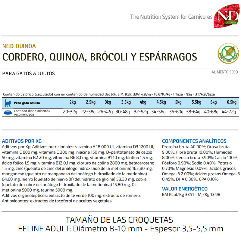 La nourriture Farmina N&D Quinoa Feline Weight Management pour chats adultes est fournie avec une proportion équilibrée de fibres Red Sea Carbohydrates, huile de saumon et céréales comme source de fibres solubles fortes pour un système digestif paisible et une texture croustillante avec la fibre grasse soluble pour une élimination appropriée et saine, des nutriments nécessaires pour maintenir un système immunitaire sain et améliorer la peau et le pelage, et de la niacine pour améliorer la digestion et les fonctions rénales.