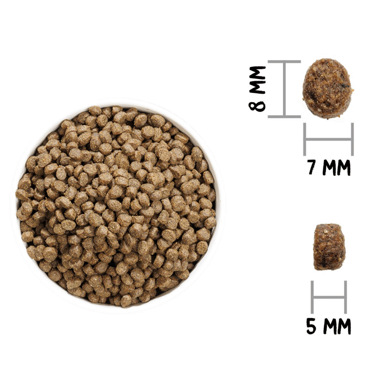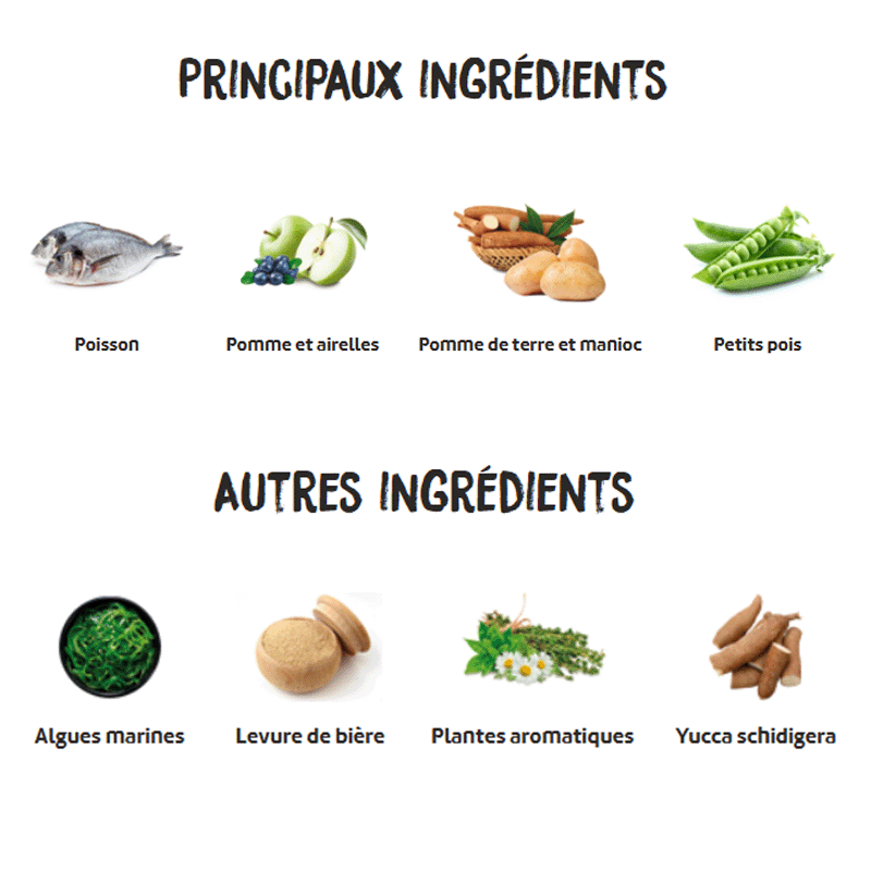 Poisson 37 % (poisson frais* min 20 % avant extrusion, saumon hydrolysé 10 %, poisson déshydraté 7 %), pois entiers* (13 %), poulet déshydraté (11 %), racines de manioc* (10 %), porc déshydraté (9 %), graisse aviaire (conservée avec des antioxydants naturels), pomme de terre déshydratée* (5 %), levure de bière* (3 %), protéine hydrolysée de poulet, pulpe de betterave, pomme* (1 %), huile de poisson (conservée avec des antioxydants naturels), sel gemme*, luzerne déshydratée*, fructo-oligosaccharides et mannan-oligosaccharides, algues marines déshydratées* (500 mg/kg), glucosamine (500 mg/kg), yucca schidigera, sulfate de chondroïtine (100 mg/kg), myrtilles* (100 mg/kg), thym* (80 mg/kg), camomille* (80 mg/kg), fenouil* (80 mg/kg), échinacée* (80 mg/kg), thé vert* (80 mg/kg).