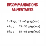 Vitamine A 25 000 UI, vitamine D3 1 500 UI, vitamine E 425 UI, vitamine C 100 mg, taurine 2 000 mg, L-carnitine 200 mg, cuivre (sulfate de cuivre (II) pentahydraté) 5 mg, cuivre (chélate de cuivre (II) d'acides aminés hydraté) 5 mg, manganèse (oxyde de manganèse (II)) 52 mg, zinc (oxyde de zinc) 100 mg, fer (sulfate de fer (II) monohydraté) 40 mg, zinc (chélate de zinc d'acides aminés hydraté) 10 mg, iode (iodure de potassium) 4 mg, sélénium (sélénite de sodium) 0,3 mg, kcal/kg 3 750. Avec des antioxydants naturels.