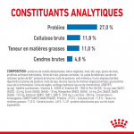 COMPOSANTS ANALYTIQUES : Protéine brute : 27,0% - Fibres brutes : 11,8% - Matières grasses brutes : 11,0% - Cendres brutes : 4,8%.