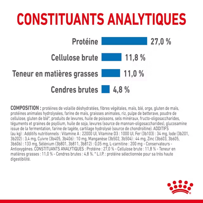 COMPOSITION : protéines de volaille déshydratées, fibres végétales, maïs, blé, orge, gluten de maïs, protéines animales hydrolysées, farine de maïs, graisses animales, riz, pulpe de betterave, cellulose en poudre, gluten de blé*, produits de levure, huile de poisson, substances minérales, fructo-oligosaccharides, graines et enveloppes de psyllium, huile de soja, levures (source de mannane-oligosaccharides), glucosamine obtenue par fermentation, farine de tagète, cartilage hydrolysé (source de chondroïtine)