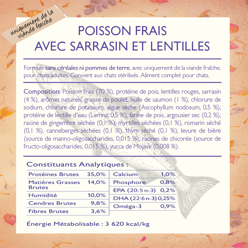Ingrédients: Poisson frais (70%), protéine de pois, lentilles rouges, sarrasin (4%), arômes naturels, graisse de poulet, huile de saumon (1%), chlorure de sodium, chlorure de potassium, algues marines séchées (Ascophyllum nodosum, 0,5%), protéine de lentille d'eau [Lemna] (0,5%), farine de pois, argousier séché (0,2%), racine de gingembre déshydratée (0,1%), canneberges séchées (0,1%), romarin déshydraté (0,1%), canneberges séchées (0,1%), thym déshydraté (0,1%), levure de bière (source de mannan-oligosaccharides, 0,015%), racine de chicorée (source de fructo-oligosaccharides, 0,015%), yucca schidigera (0,008%).
