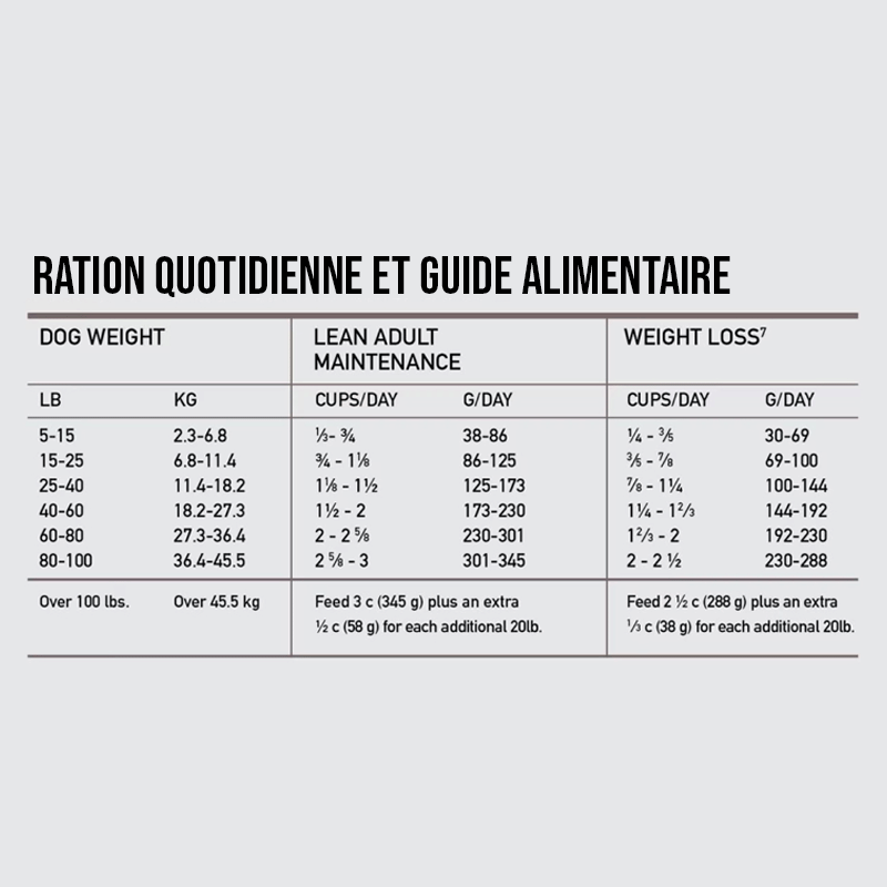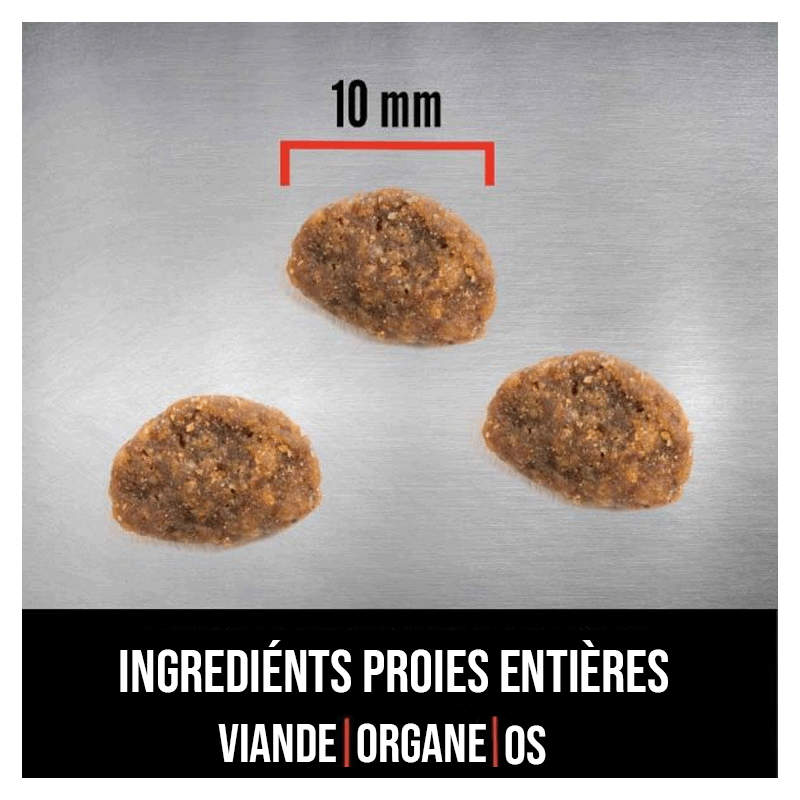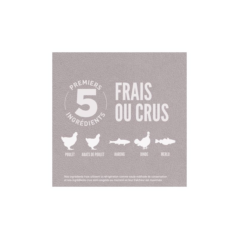 COMPOSITION : Poulet frais (25 %), hareng entier cru (6 %), dinde crue (6 %), abats de poulet frais (foie, cœur) (6 %), merlu entière et crue (5 %), maquereau entier et cru (5 %), œufs frais (5 %), poulet déshydraté (4 %), maquereau déshydraté (4 %), sardine déshydratée (4 %), hareng déshydraté (4 %), dinde déshydratée (4 %), poisson blanc déshydraté (4 %), fibre de lentille, haricots rouges entiers, haricots blancs entiers, pois chiches entiers, lentilles rouges entières, lentilles vertes entières, pois entiers, amidon de pois, foie de dinde cru (1,5 %), graisse de poulet (1,5 %), fibre de pomme, algues (source de DHA), algues marines séchées, citrouille fraîche entière, courge butternut fraîche entière, courgette verte fraîche entière, carottes fraîches entières, pommes fraîches entières, poires fraîches entières, racine de chicorée séchée, chou frisé frais, épinards frais, feuilles de betterave fraîches, feuilles de navet fraîches, canneberges entières, myrtilles entières, baies de Saskatoon entières, curcuma, chardon-Marie, racine de bardane, lavande, racine de guimauve, cynorrhodon.