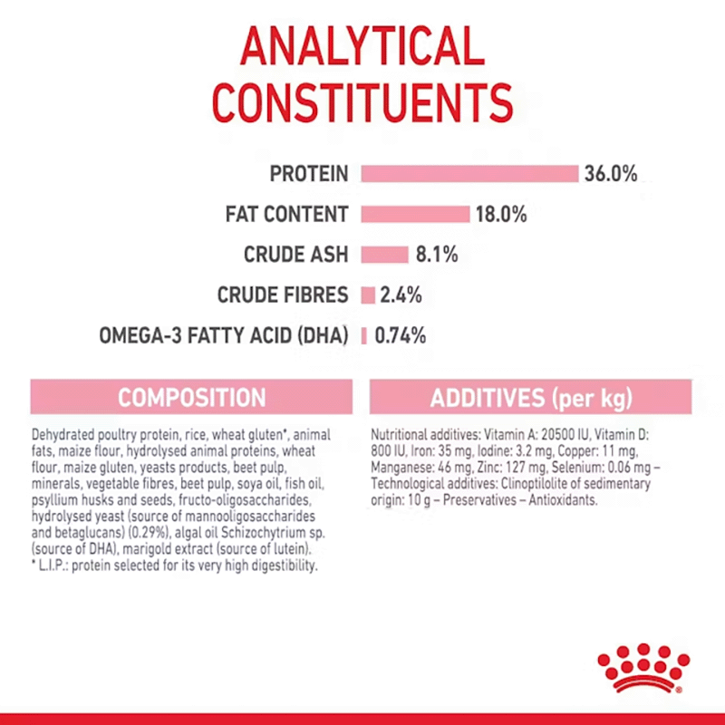 COMPOSITION : protéines de volaille déshydratées, riz, gluten de blé*, graisses animales, farine de maïs, protéines animales hydrolysées, farine de blé, gluten de maïs, produits de levures, pulpe de betterave, fibres végétales, sels minéraux, huile de soja, huile de poisson, téguments et graines de psyllium, fructo-oligosaccharides, levures hydrolysées (source de mannan-oligosaccharides et de bêta-glucanes) (0,29 %), huile d’algues Schizochytrium sp. (source de DHA), farine de tagète. * L.I.P. : protéine sélectionnée pour sa très haute digestibilité.