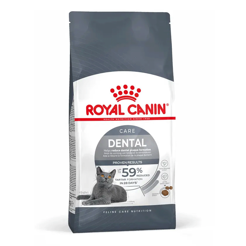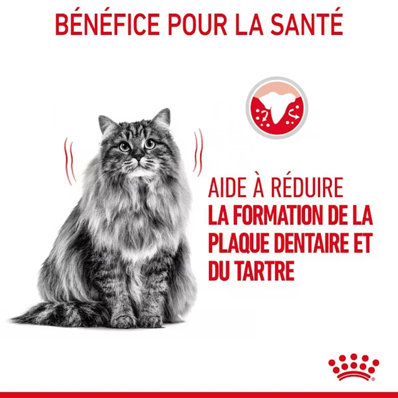 Les croquettes pour chat Oral Care de Royal Canin conviennent aux félins de 1 à 10 ans et contribuent à améliorer l'hygiène dentaire. Ce aliment présente des croquettes de forme spécifique agissant comme une brosse à dents, en grattant entre les dents et les molaires du chat pendant la mastication.