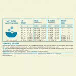 Contenu calorique (calculé) : Énergie métabolisable 3.930 kcal/kg (472 kcal par tasse de 250 ml/120 g), avec 38 % de protéines, 23 % de glucides et 39 % de graisses.