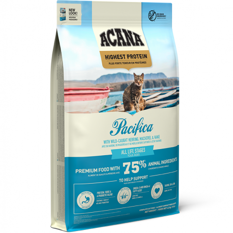 ACANA Pacifica est une alimentation sèche pour chats conçue pour toutes les races et étapes de la vie. Elle est fabriquée à partir d'un mélange de poissons frais, notamment du hareng sauvage, du maquereau, de la sole, de l'aiglefin et du poisson de roche, présenté en portions entières de proies comprenant de la viande, des organes et des os. Cette recette imite l'alimentation naturelle dont les chats ont besoin pour rester en bonne santé, en fournissant des nutriments essentiels.