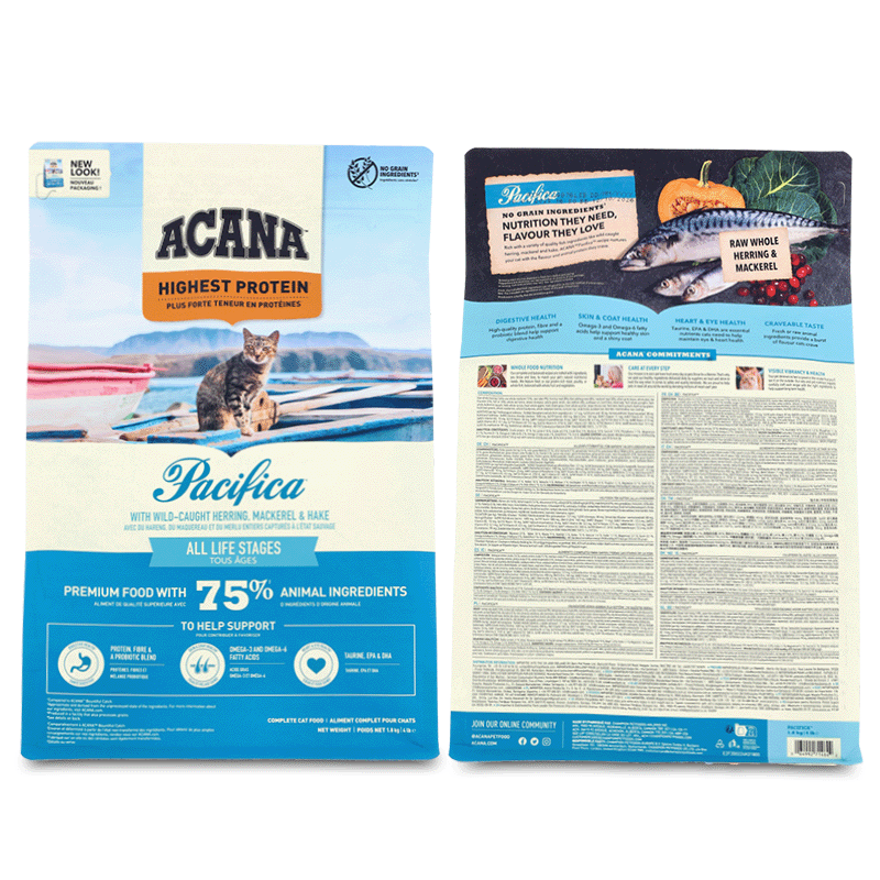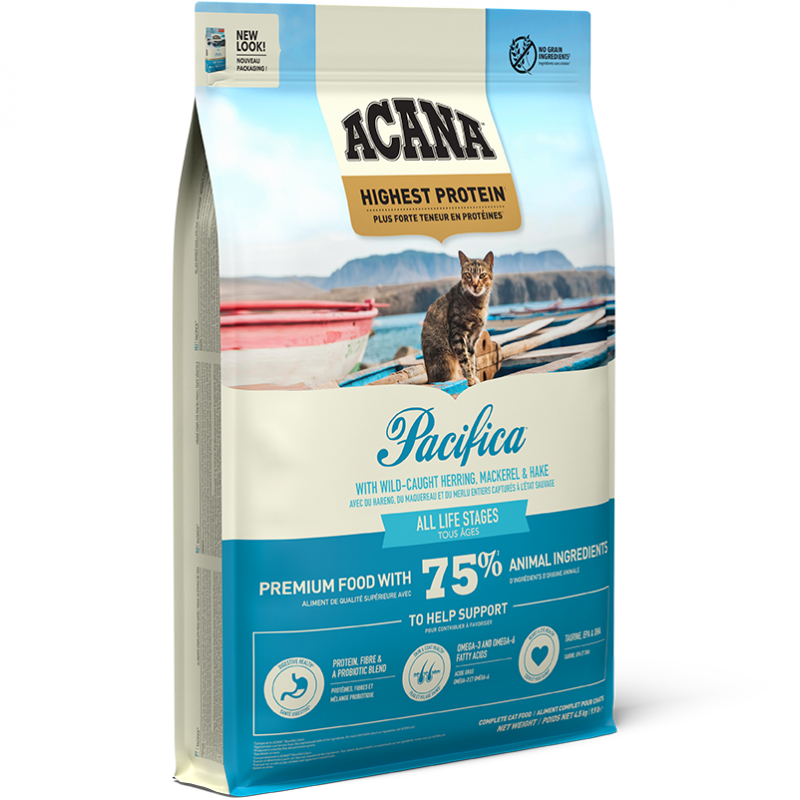 ACANA Pacifica, formulé avec des protéines d'origine animale telles que le hareng, le maquereau et plus encore, satisfait le régime naturel des chats.