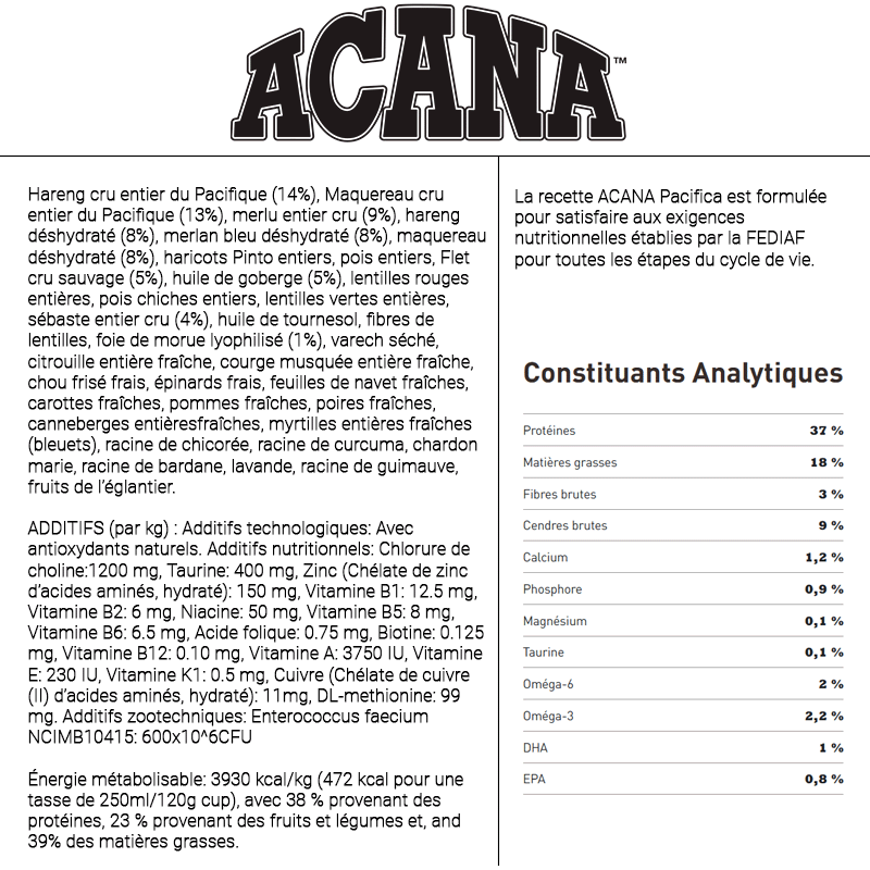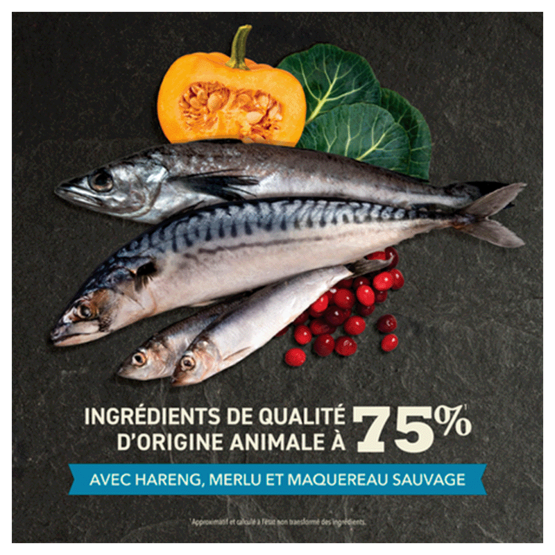 Ingrédients : Hareng entier cru (16 %), maquereau entier cru (12 %), merlu cru (9 %), hareng déshydraté (8 %), merlu de l'Atlantique déshydraté (8 %), maquereau déshydraté (8 %), haricots pinto entiers, pois entiers, plie crue (5 %), huile de poisson (5 %), lentilles rouges entières, pois chiches entiers, lentilles vertes entières, poisson de roche cru (4 %), huile de tournesol, fibre de lentille, algues séchées, courge fraîche entière, courge butternut fraîche entière, carottes fraîches entières, pommes fraîches entières, poires fraîches entières, courgettes fraîches entières, racine de chicorée déshydratée, chou frisé frais, épinards frais, feuilles de navet fraîches, feuilles de betterave fraîches, canneberges entières, myrtilles entières, baies de Saskatoon entières, racine de curcuma, chardon de marie, racine de bardane, lavande, racine de guimauve, cynorrhodons.