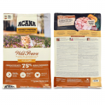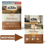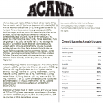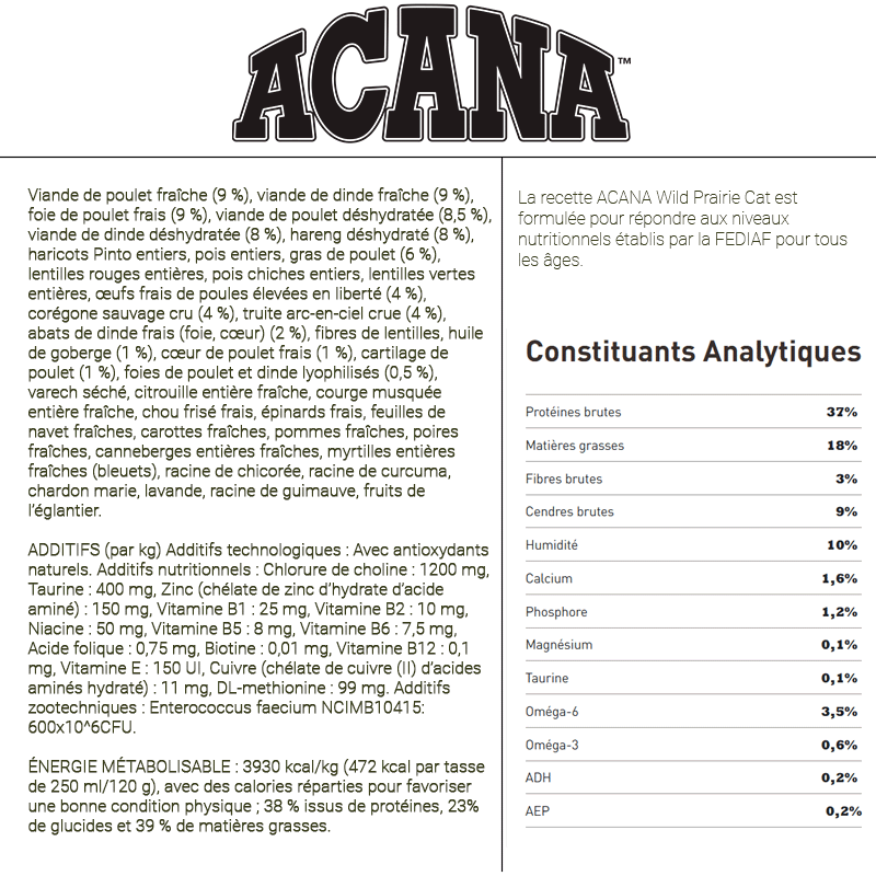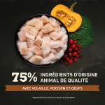 Ingrédients : Poulet frais (11 %), dinde crue (10 %), abats de poulet frais (foie, cœur, gésier) (9 %), poulet déshydraté (9 %), dinde déshydratée (8 %), hareng déshydraté (8 %), haricots pinto entiers, pois entiers, graisse de poulet (5 %), lentilles rouges entières, pois chiches entiers, lentilles vertes entières, œufs frais (4 %), poisson d'eau douce cru* (4 %), truite crue (4 %), foie de dinde cru (2 %), fibre de lentilles, huile de poisson (1 %), algues déshydratées, courge fraîche entière, courge butternut fraîche entière, carottes fraîches entières, pommes fraîches entières, poires fraîches entières, courgette fraîche entière, racine de chicorée déshydratée, chou frisé frais, épinards frais, feuilles de navet fraîches, feuilles de betterave fraîches, canneberges entières, myrtilles entières, baies de Saskatoon entières, racine de curcuma, chardon de marie, racine de bardane, lavande, racine de guimauve, cynorrhodons.