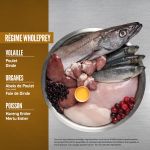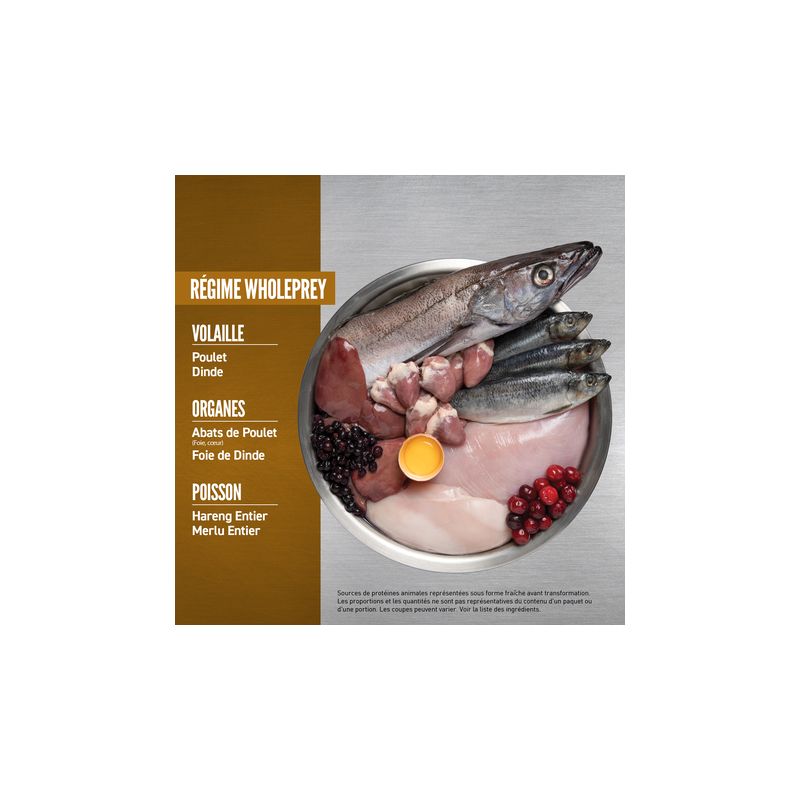Poulet frais (21 %), dinde crue (11 %), abats de poulet frais (foie, cœur) (10 %), merlu cru entier (5 %), hareng cru entier (5 %), œufs frais (5 %), foie de dinde cru (5 %), poulet déshydraté (5 %), maquereau déshydraté (5 %), sardine déshydratée (4,5 %), hareng déshydraté (4 %), lentilles rouges entières, lentilles vertes entières, pois entiers, fibre de lentilles, pois chiches entiers, haricots pintos entiers, amidon de pois, dinde déshydratée (2 %), graisse de poulet (2 %), haricots blancs entiers, huile de goberge (0,5 %), varech déshydraté, courge fraîche entière, courge butternut fraîche entière, courgettes fraîches entières, carottes fraîches entières, pommes fraîches entières, poires fraîches entières, racine de chicorée déshydratée, chou frisé frais, épinards frais, feuilles de betterave fraîches, feuilles de moutarde fraîches, canneberges entières, myrtilles entières, baies de saskatoon entières, curcuma, chardon-Marie, racine de bardane, lavande, racine de guimauve, cynorrhodon.