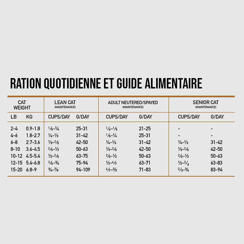 L'énergie métabolisable est de 3760 kcal/kg (451 kcal par tasse de 250 ml/120 g). Les calories sont réparties pour maintenir des conditions optimales, dont 40 % proviennent des protéines, 22 % des glucides et 38 % des matières grasses. Non destiné à la consommation humaine.