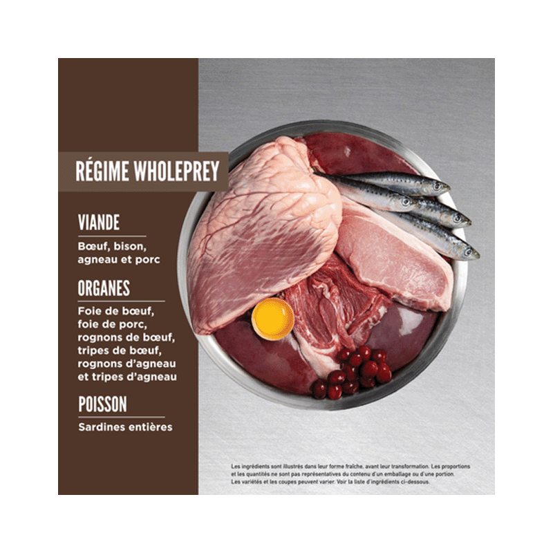 Sardine crue entière (18 %), maquereau cru entier (11 %), merlu cru entier (10 %), plie crue entière (6 %), roche crue entière (6 %), limande crue entière (6 %), maquereau déshydraté (5 %), hareng déshydraté (5 %), poisson blanc déshydraté (5 %), sardine déshydratée (5 %), églefin déshydraté (4 %), huile de hareng (4 %), lentilles rouges entières, pois entiers, fibre de lentilles, haricots pintos entiers, amidon de pois, huile de tournesol, varech déshydraté, courge fraîche entière, courge butternut fraîche entière, courgettes fraîches entières, carottes fraîches entières, pommes fraîches entières, poires fraîches entières, racine de chicorée déshydratée, chou frisé frais, épinards frais, feuilles de betterave fraîches, feuilles de moutarde fraîches, canneberges entières, myrtilles entières, baies de saskatoon entières, curcuma, chardon-Marie, racine de bardane, lavande, racine de guimauve, cynorrhodon.