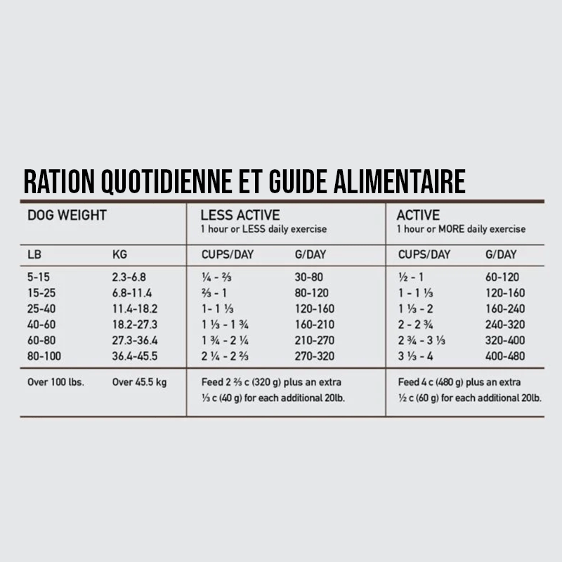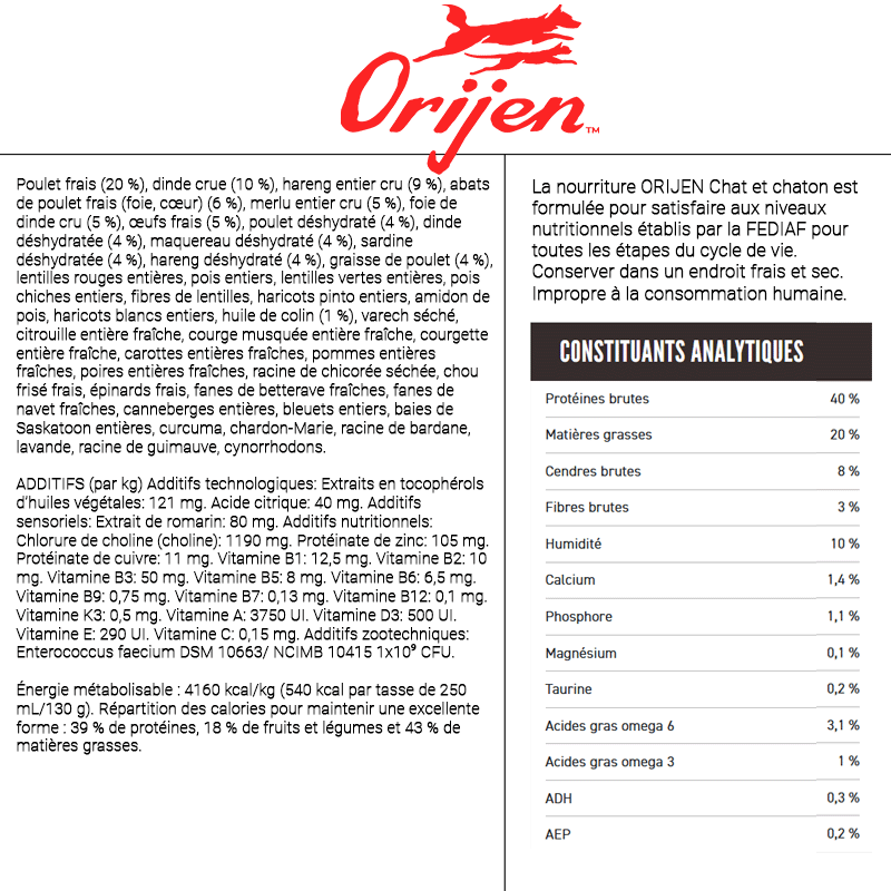 L'énergie métabolisable est de 3880 kcal/kg (466 kcal par tasse de 250 ml/120 g), avec des calories bien réparties pour maintenir des conditions optimales, dont 39 % proviennent des protéines, 19 % des glucides et 42 % des matières grasses. | ORIJEN™ Six Fish™ Dog Food est formulé pour répondre aux recommandations nutritionnelles établies par la FEDIAF pour les aliments pour chiens à toutes les étapes de la vie, à l'exception de la croissance du chiot danois de moins de 14 semaines. Conservez dans un endroit frais et sec. Non destiné à la consommation humaine.