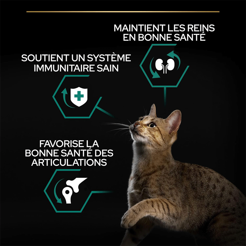 Promotion de la santé rénale : PURINA® PRO PLAN® Adult 1+ RENAL PLUS se distingue par sa capacité à favoriser une fonction rénale saine chez les chats adultes. La formule est conçue avec des nutriments spécifiques qui contribuent à maintenir les reins en bon état, ce qui est fondamental pour le bien-être général de votre félin. Cette caractéristique est particulièrement précieuse, car la santé rénale est essentielle pour la qualité de vie de votre animal.
