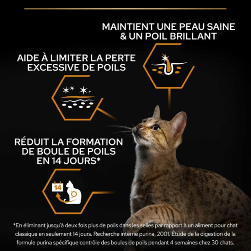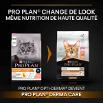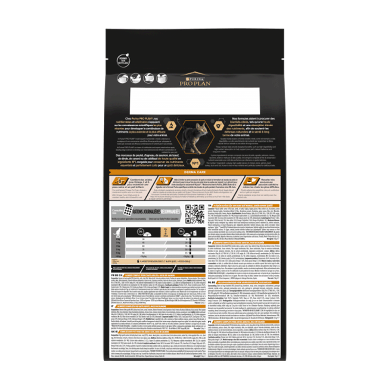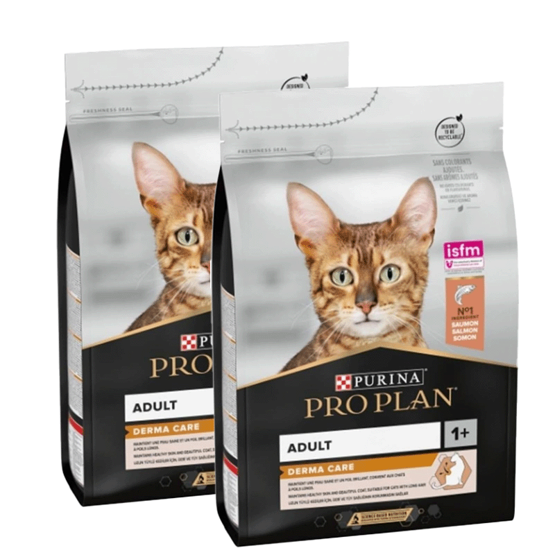 Contrôle de la formation des boules de poils : PURINA PRO PLAN Adult Derma Care, riche en saumon, est spécialement formulé pour aider à contrôler la formation des boules de poils chez les chats. Cela assure un transit doux et sécurisé des poils à travers le tractus digestif, évitant d'éventuelles obstructions et malaises.