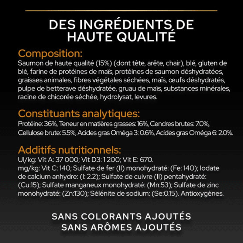 Saumon de haute qualité (15%, y compris tête, colonne vertébrale, viande), blé, gluten de blé, farine de protéines de maïs, protéines de saumon déshydratées, matières grasses animales, fibre végétale déshydratée, maïs, œuf déshydraté, pulpe de betterave déshydratée, semoule de maïs, minéraux, racine de chicorée déshydratée, hydrolysat de protéines, levure.