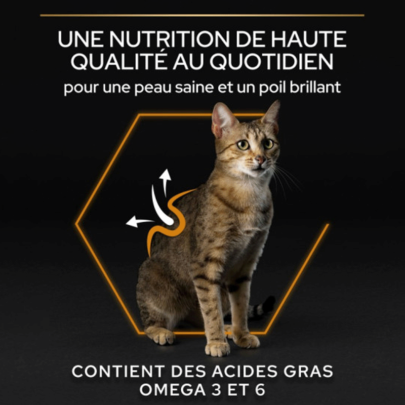 Promotion d'une peau et d'un pelage sains : L'aliment est riche en acides gras oméga-3 et oméga-6, ce qui contribue à maintenir un pelage brillant et soyeux, particulièrement bénéfique pour les chats à la peau sensible. Cela améliore l'apparence et le confort de votre animal de compagnie.