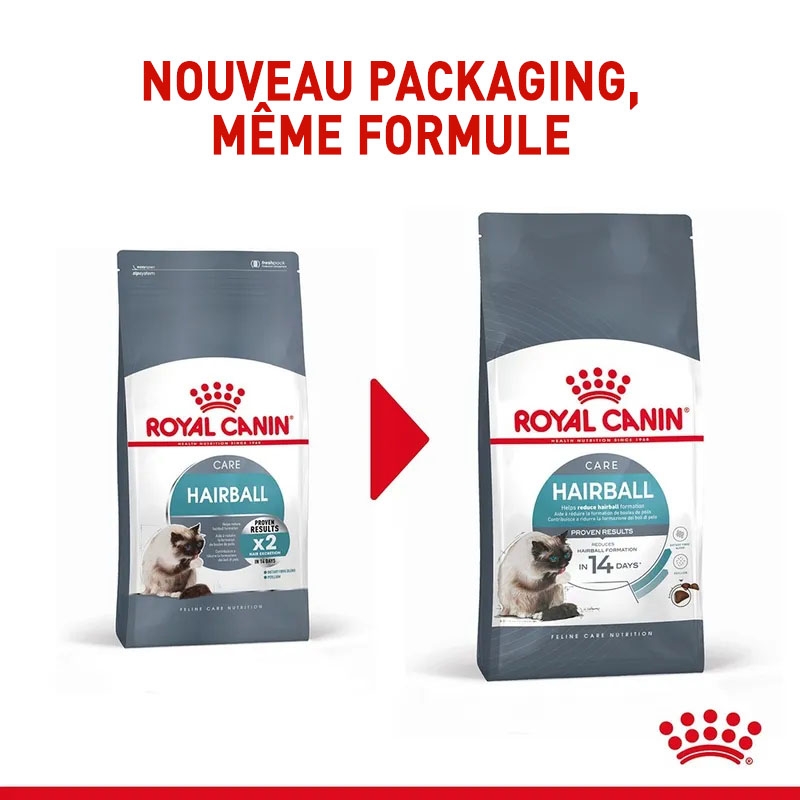 Les chats passent beaucoup de temps à se toiletter, ce qui peut entraîner l'ingestion de poils. Cela peut provoquer la formation de boules de poils dans leur système digestif, qui sont souvent régurgitées ou expulsées dans les selles. Hairball Care de ROYAL CANIN® aborde ce problème en incluant un mélange spécial de fibres, telles que le psyllium, qui stimule le transit intestinal de manière naturelle. Cela permet d'éliminer les poils ingérés par les selles au lieu de s'accumuler dans l'estomac.