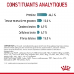Constituants analytiques : Protéine brute : 34% - Matières grasses brutes : 15% - Cendres brutes : 6,9% - Fibre brute : 6,9% - Fibres alimentaires totales : 15,2%.