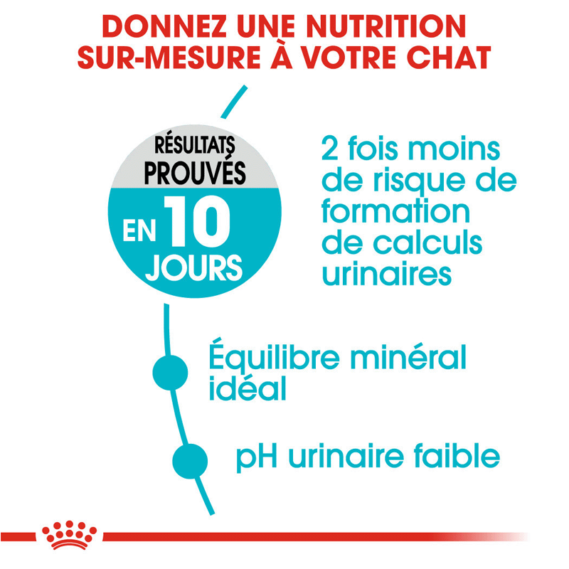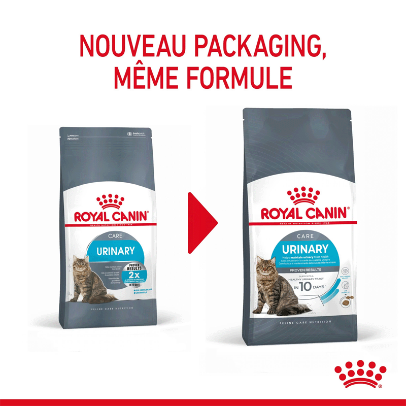 Urinary Care de ROYAL CANIN® est une formule nutritionnelle précise qui soutient la santé du tractus urinaire de votre chat. Cette formule exclusive aide à contrôler les niveaux de minéraux et à réduire le pH urinaire, favorisant une urine moins concentrée et un équilibre urinaire optimal. En seulement 10 jours d'utilisation exclusive,