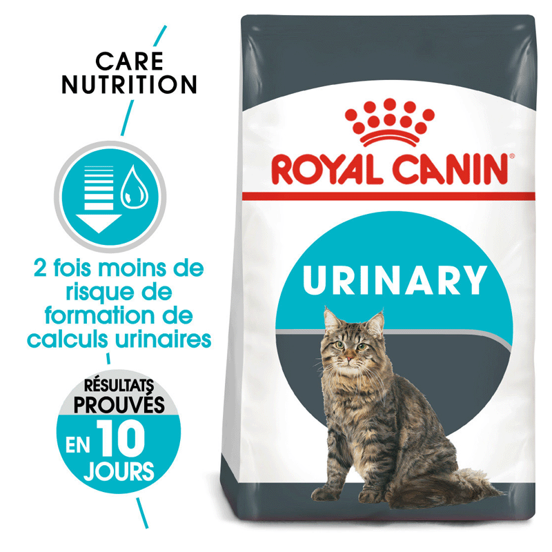 Royal Canin Urinary Care est une alimentation pour chats adultes qui réduit le risque de formation de calculs urinaires. Sa formule aide à contrôler les niveaux de minéraux et abaisse le pH urinaire. Votre animal produira une urine moins concentrée.
