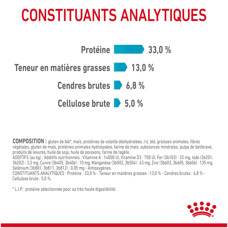 Constituants analytiques : Protéine brute : 33% - Matières grasses brutes : 13% - Cendres brutes : 6,6% - Fibres brutes : 5%.