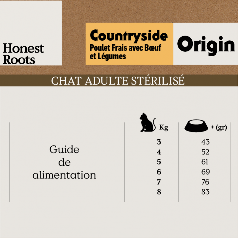 Introduisez Honest Roots Origin Countryside pour chats stérilisés progressivement sur 7 jours. Divisez la ration quotidienne en 2 repas ou plus et assurez-vous que votre chat dispose toujours de l’eau fraîche.