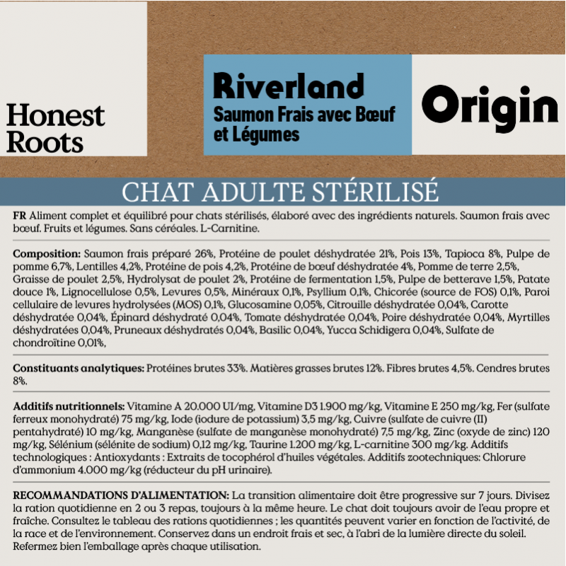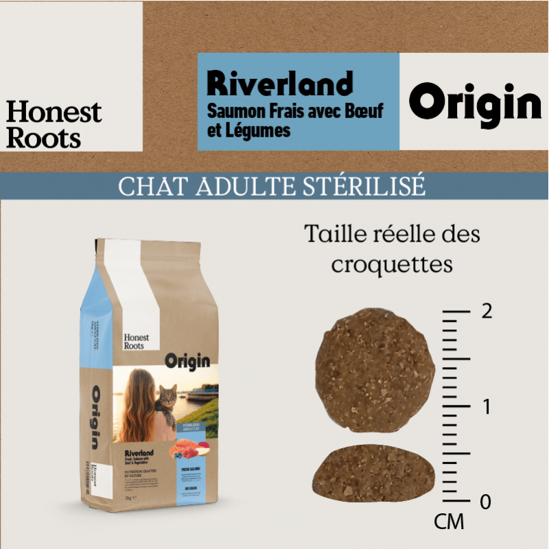 Honest Roots Origin Riverland sont des croquettes naturelles sans céréales pour chats stérilisés à la recherche d’un régime équilibré, léger et savoureux. Leur recette associe saumon frais et viande de boeuf, sources de protéines de haute qualité qui apportent vitalité, musculature ferme et pelage brillant. C’est un aliment complet avec de la L-carnitine pour aider à contrôler le poids, idéal pour les chats moins actifs après stérilisation.