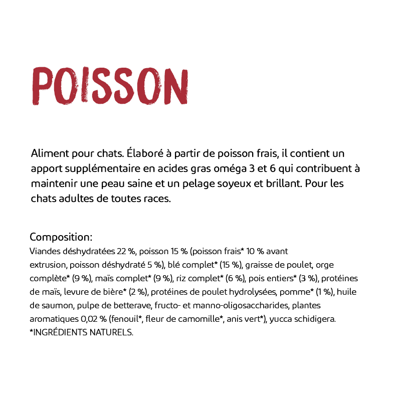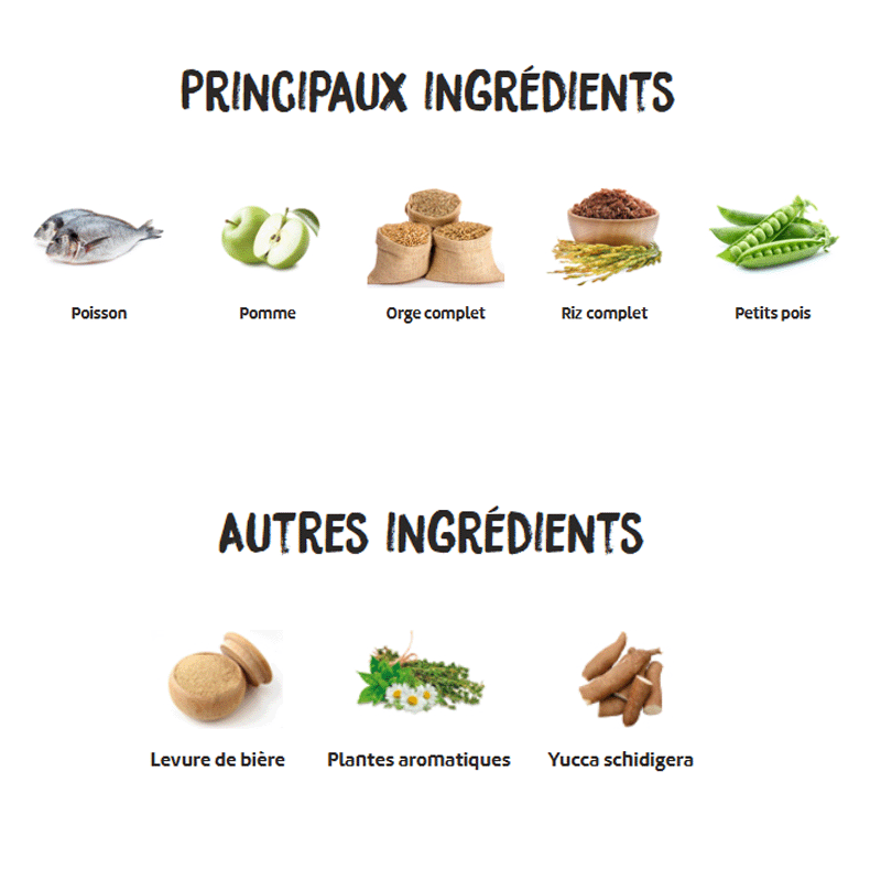 Viandes déshydratées 22%, poisson 15% (poisson frais* 10% avant l'extrusion, poisson déshydraté 5%), blé complet* (15%), graisse de poulet, orge entière* (9%), maïs complet* (9%), riz complet* (6%), pois entiers* (3%), protéine de maïs, levure de bière* (2%), protéine hydrolysée de poulet, pomme* (1%), huile de saumon, pulpe de betterave, fructo et manano oligosaccharides, plantes aromatiques 0,02% (fenouil*, fleur de camomille*, anis vert*), yucca schidigera. *INGRÉDIENTS NATURELS