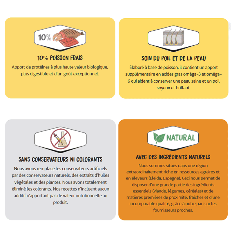 Formulé avec du poisson frais, cette nourriture fournit des acides gras oméga 3 et 6 pour la peau et le pelage.