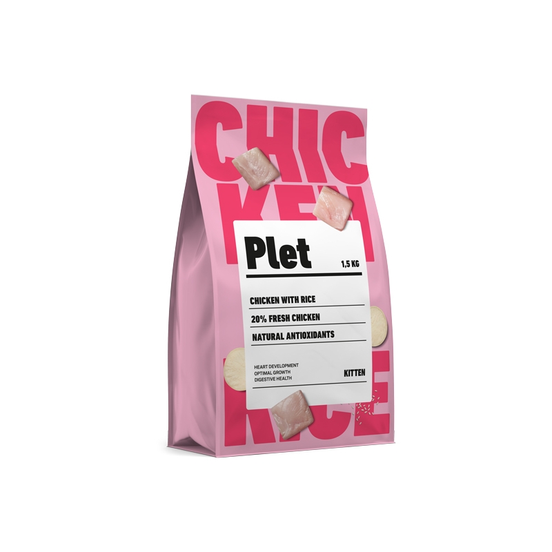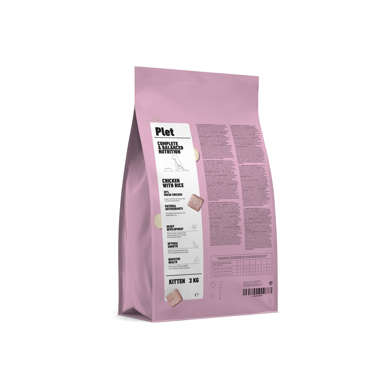 Aliment spécial pour chatons au goût de poulet avec du riz. PLET offre une alimentation complète et équilibrée. Son premier ingrédient est du poulet frais à 20%, apportant une grande valeur nutritionnelle durant les premières étapes de la vie du chat.
