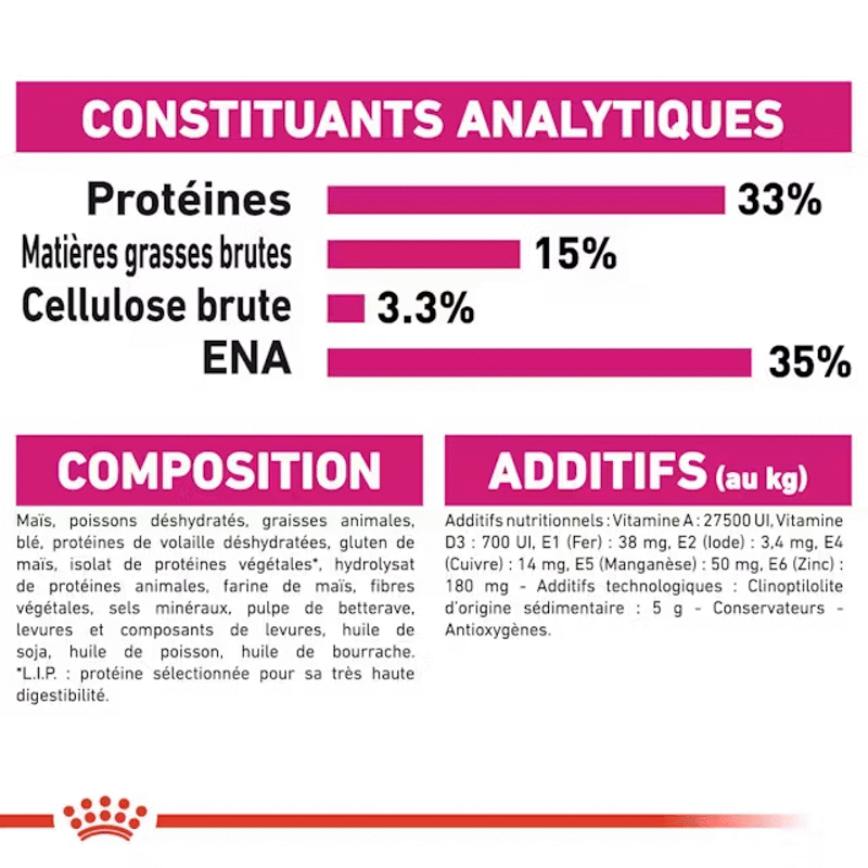 COMPOSITION : maïs, poissons déshydratés, graisses animales, blé, protéines de volaille déshydratées, gluten de maïs, isolat de protéines végétales*, hydrolysat de protéines animales, farine de maïs, fibres végétales, sels minéraux, pulpe de betterave, levures et composants de levures, huile de soja, huile de poisson, huile de bourrache. ADDITIFS (au kg) : Additifs nutritionnels : Vitamine A : 27500 UI, Vitamine D3 : 700 UI, E1 (Fer) : 38 mg, E2 (Iode) : 3,4 mg, E4 (Cuivre) : 14 mg, E5 (Manganèse) : 50 mg, E6 (Zinc) : 180 mg - Additifs technologiques : Clinoptilolite d’origine sédimentaire : 5 g - Conservateurs - Antioxygènes. CONSTITUANTS ANALYTIQUES : Protéine : 33 % - Matières grasses brutes : 15 % - Cendres brutes : 8,2 % - Cellulose brute : 3,3 %. MODE D’EMPLOI : voir tableau. Numéro de lot et d’identifiant usine, à utiliser de préférence avant : voir sur l’emballage. À conserver dans un endroit sec et frais. *L.I.P. : protéine sélectionnée pour sa très haute digestibilité.