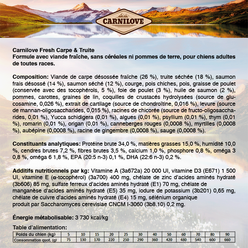Carnilove Carpe Fraîche et Truite a été créé avec un profond respect pour les lois de la nature, offrant à votre fidèle compagnon canin une alimentation équilibrée enrichie en poissons frais et fruits de mer, complétés par une sélection variée de légumes, de baies et d'herbes. Adopter une alimentation naturelle contribue à maintenir une condition physique optimale, à préserver la santé cardiovasculaire, à nourrir la peau sèche et à garantir un pelage sain et brillant.