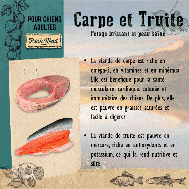 La carpe se distingue par sa composition unique de protéines facilement digestibles, en raison de sa faible teneur en fibres musculaires. La combinaison de carpe et de truite constitue une source naturelle d'acides gras oméga-3 essentiels, hautement bénéfiques pour la qualité de la peau et du pelage. La présence de DHA et d'EPA apporte des effets positifs dans cette combinaison spéciale de protéines, offrant une gamme d'avantages extraordinaires pour votre fidèle compagnon.