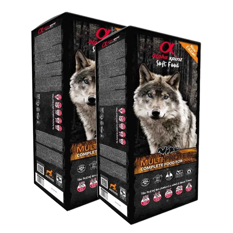 Croquettes semi-humides Alpha Spirit Multiprotein de 9 Kg avec une recette de viande et poisson frais pour chiens adultes. C'est un aliment doux et semi-humide, riche en protéines pour renforcer les muscles et les os, facilement absorbables.
