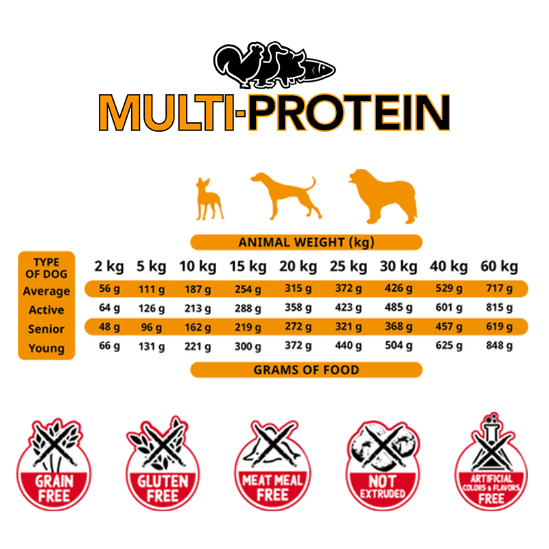35 % de viande de poulet fraîche, 20 % de poisson entier frais (sardine (Sardinella aurita), maquereau (Scomber scombrus), chinchard (Trachurus spp.), pilchard (Sardina pilchardus)), 15 % de viande de porc fraîche, 10 % de viande de canard fraîche, 5 % de foie de porc frais, amidon hydrolysé, glycérine végétale (USP), œufs, pulpe de Beta Vulgaris, levure de bière (Saccharomyces cerevisiae), citrouille, banane, ananas, cumin (Cuminum cyminum), sauge (Salvia officinalis), gingembre (Zingiber officinale), curcuma (Curcuma longa)