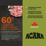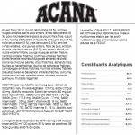 Acana Adult Large Breed Recipe est une alimentation complète pour chiens adultes de grandes races. Il est soigneusement formulé pour fournir des nutriments essentiels qui aident à maintenir une santé optimale à cette étape de la vie du chien. La nourriture est fabriquée à partir d'ingrédients frais de qualité, ainsi que de fruits et légumes biologiques riches en nutriments, pour fournir une nutrition optimale. Tous les ingrédients proviennent de sources certifiées locales ou régionales au Canada. De plus, il n'y a aucun ingrédient produit artificiellement, ni conservateurs ni colorants dans la composition.