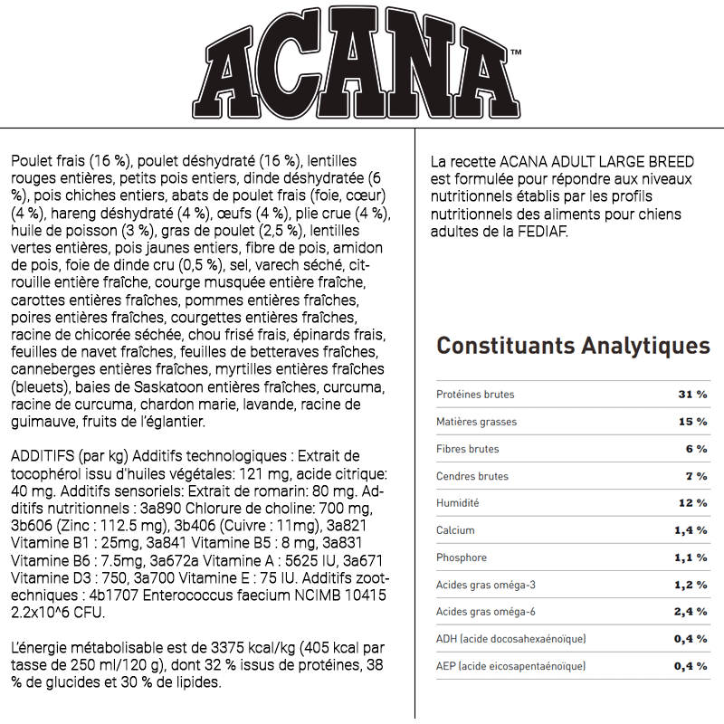 Acana Large Breed est composé de viande de poulet, de dinde et d'harang frais du cœur du Canada, ainsi que d'aliments locaux traditionnels tels que le persil, l'artichaut, le manioc et la courgette. Cette alimentation est également riche en Omega 3 et Omega 6 provenant de sources végétales naturelles telles que les pommes, les épinards, les patates douces et les myrtilles sauvages, pour favoriser une santé optimale. Les avantages d'Acana Adult Large Breed sont nombreux. Il fournit une énergie optimale, maintenant ainsi les chiens adultes de grandes races en bonne santé.