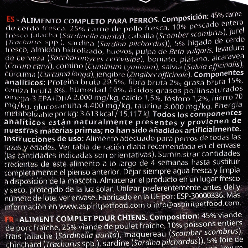 45% de viande de porc fraîche, 25% de viande de poulet fraîche, 10% de poisson entier frais (alacha, maquereau, chinchard, sardine), 5% de foie de porc frais, amidon hydrolysé, œufs, pulpe de Beta vulgaris, levure de bière, patate douce, banane, carvi, cumin, sauge, curcuma, gingembre.