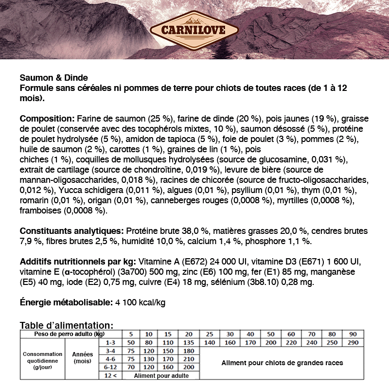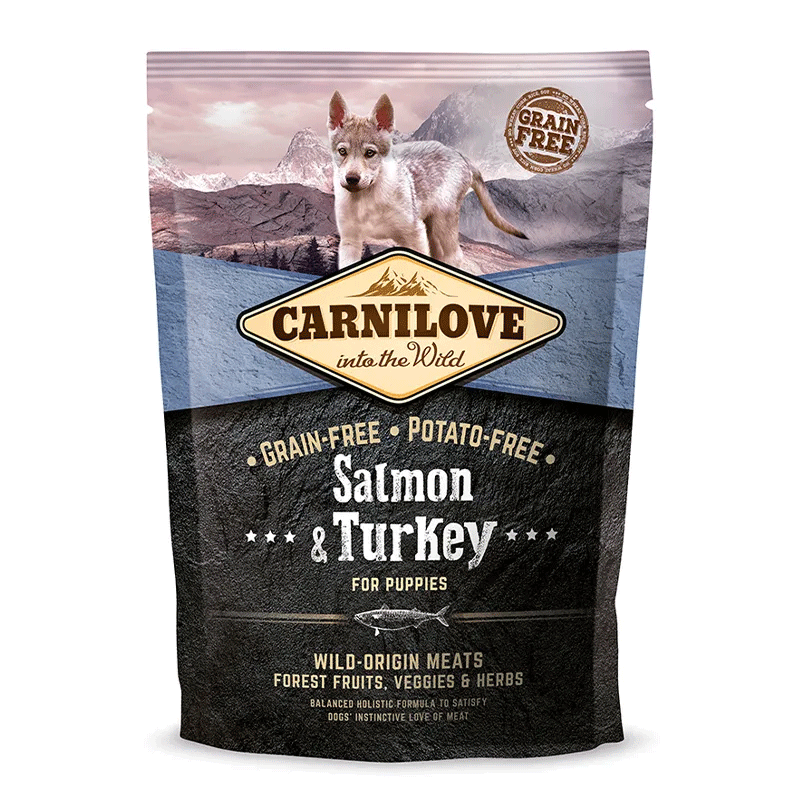 La nourriture Carnilove Puppy au saumon et à la dinde est conçue pour répondre aux besoins spéciaux de votre chiot, afin qu'il grandisse fort et en bonne santé.